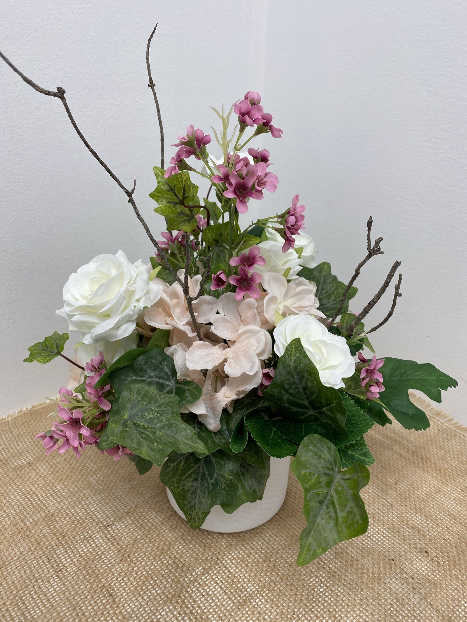 Contient: De belle roses blanche, mini roses blanche, hydrangée accompagné de son li et son feuillage lierres dans un vase.