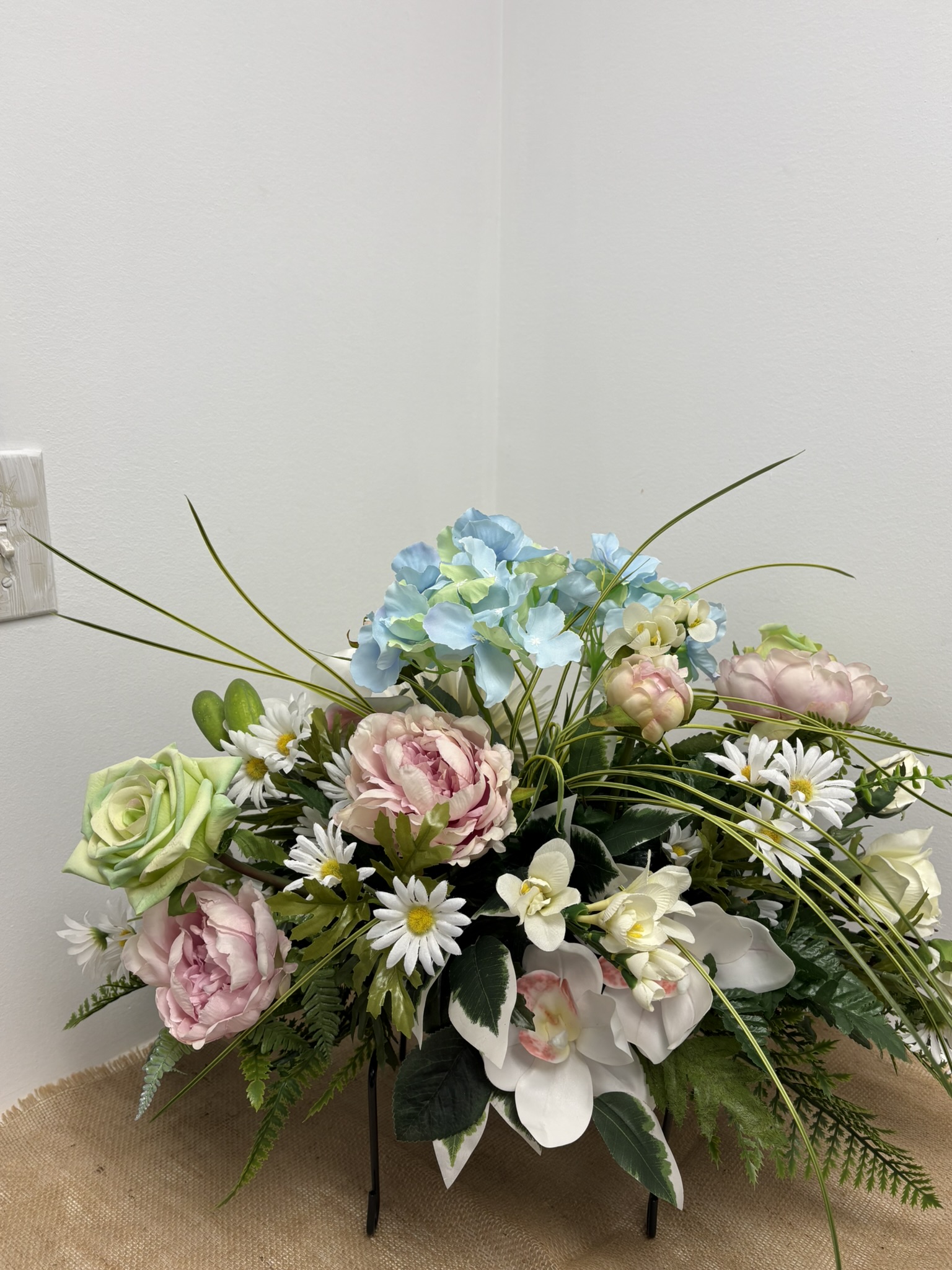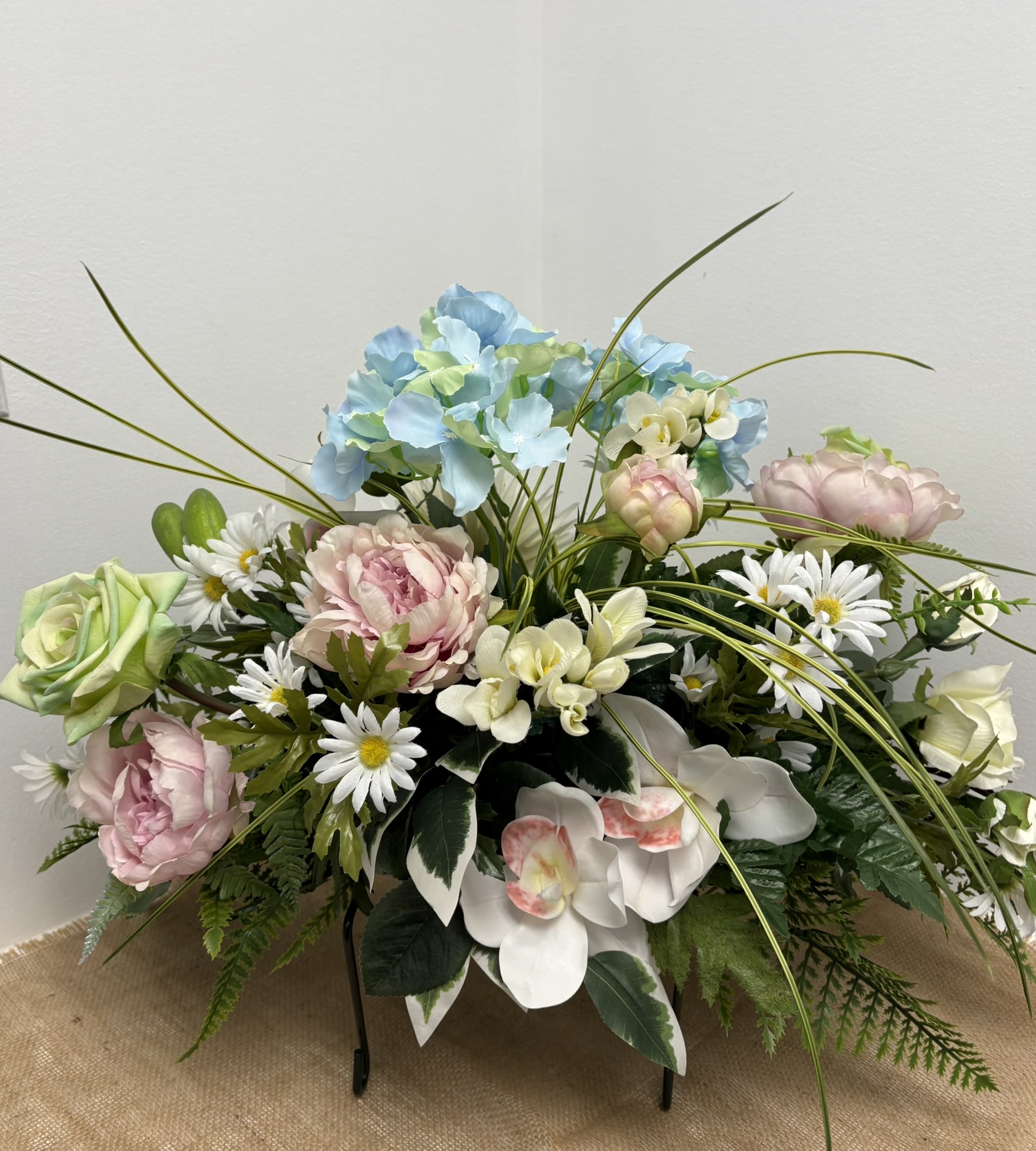 Fleur: marguerite blanche, hydrangé bleur, orchidé, et pivoine rose etc… et son accompagnement de feuillage.