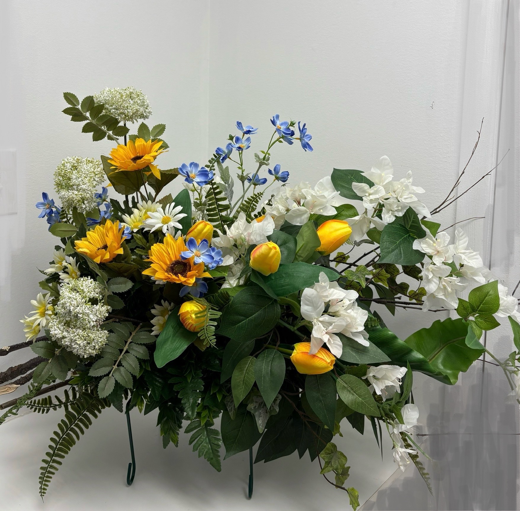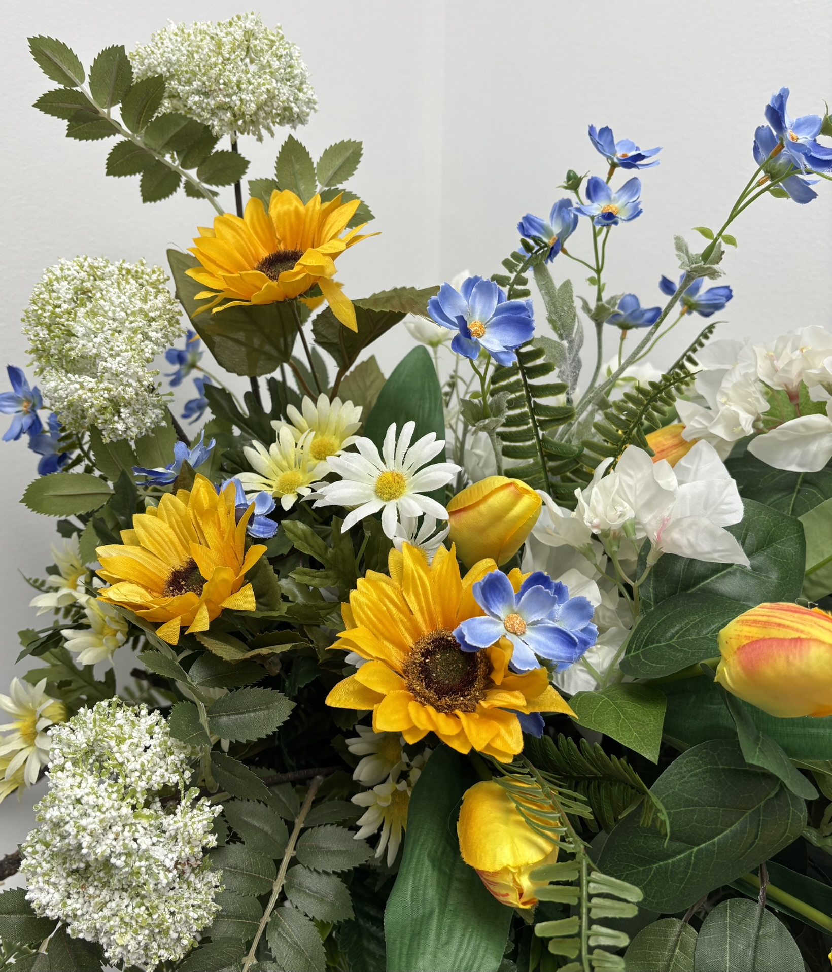 Fleur: Un beau mélange de fleurs tulipe jaune, tournesol , marguerite , delphium bleu et son accompagnement de feuillage.