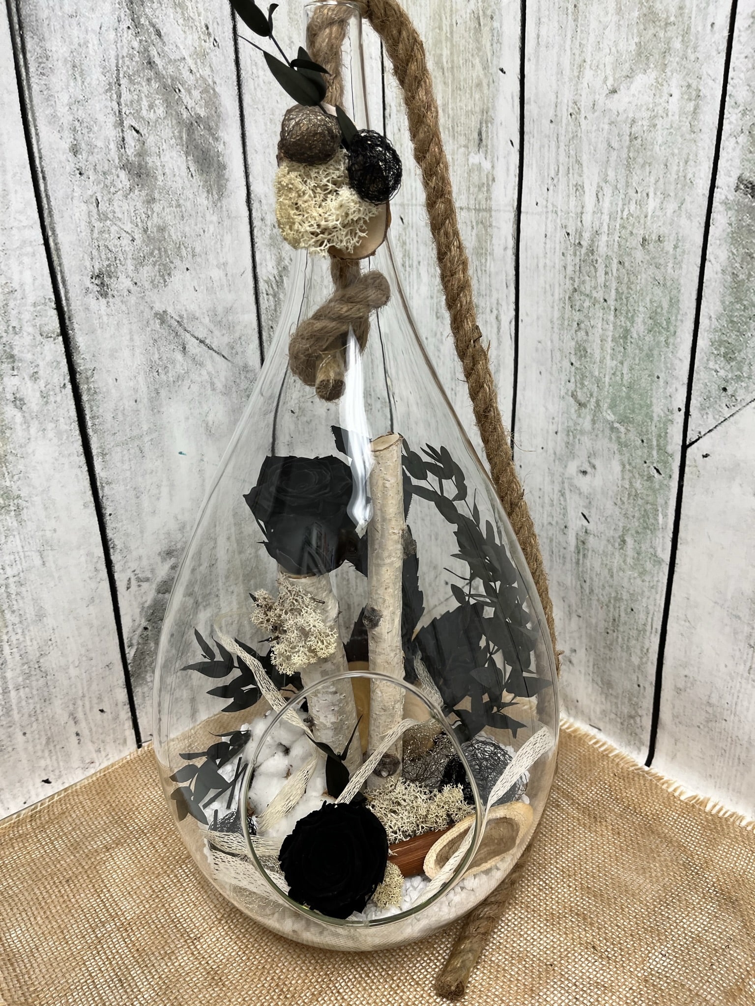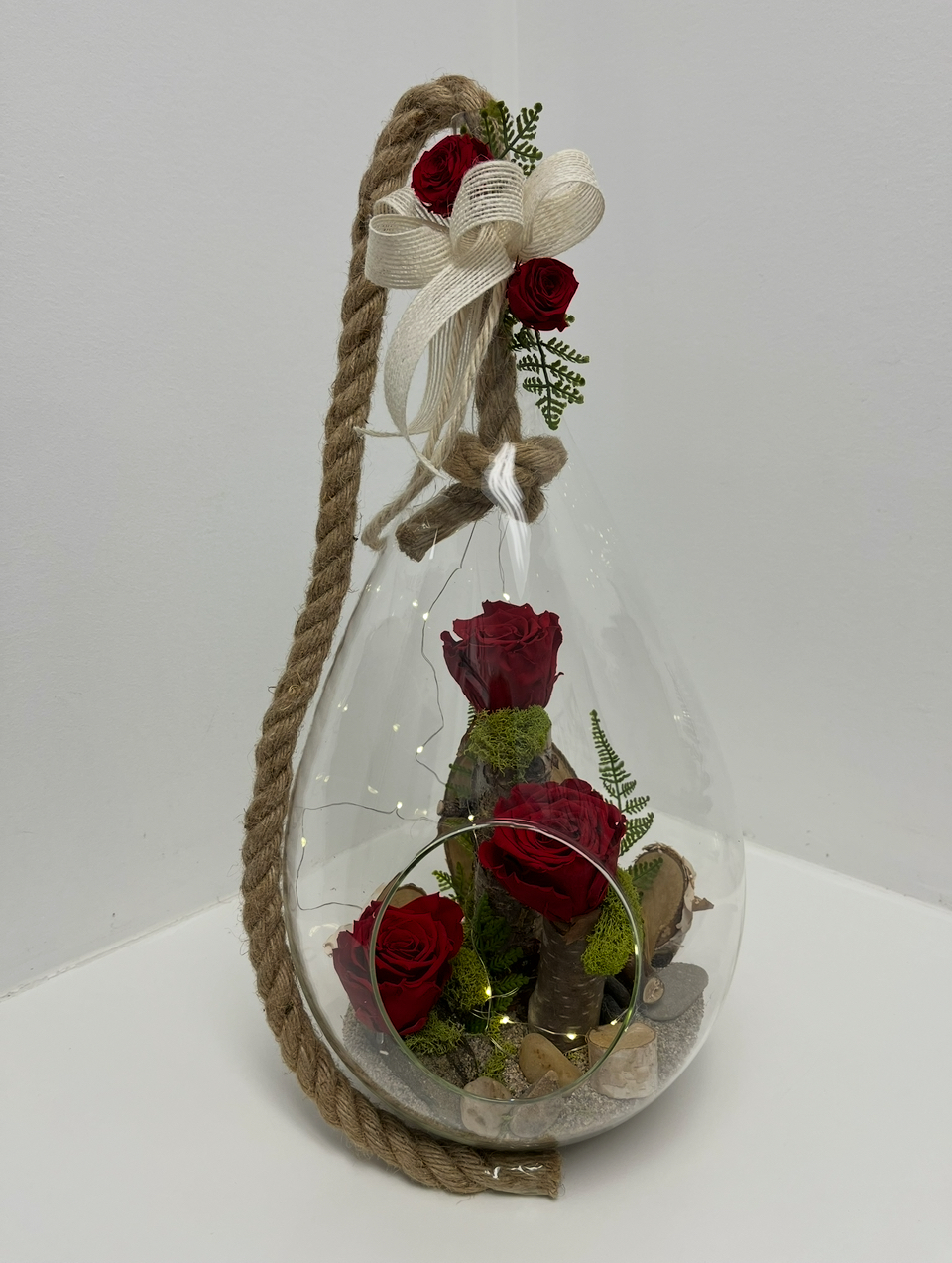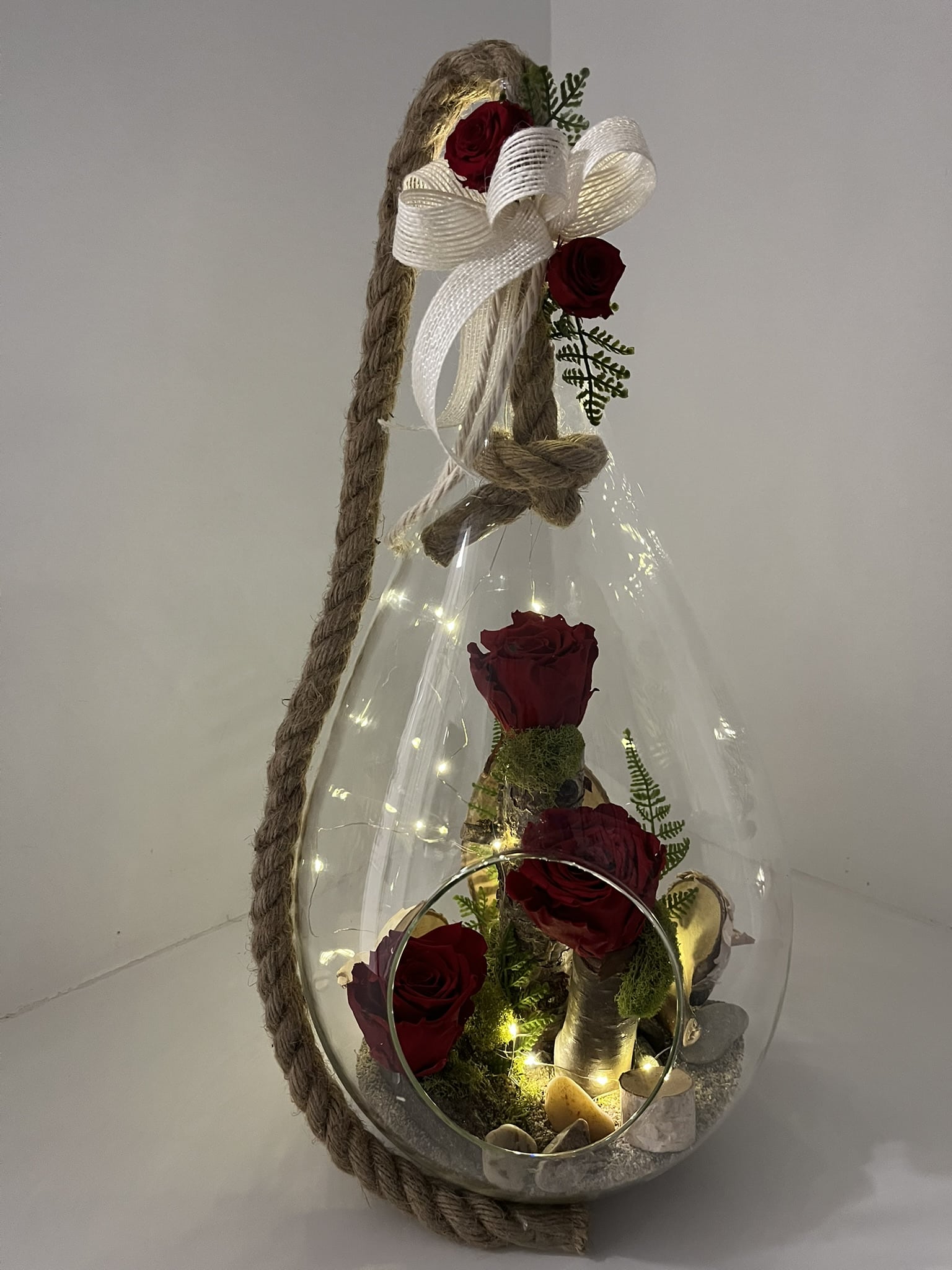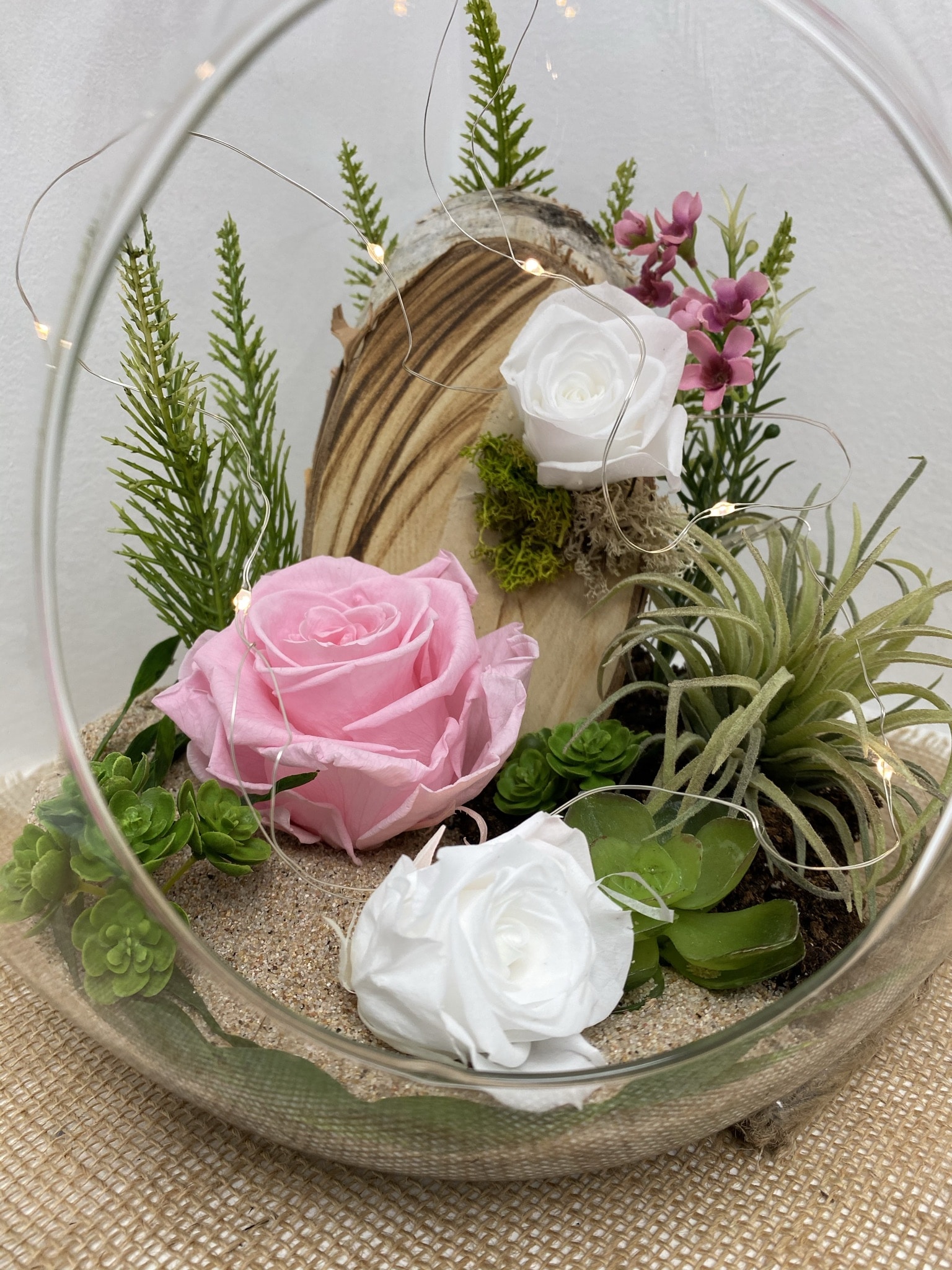 Roses éternelles avec plante grasse permanant dans une bulle en forme de goutte.